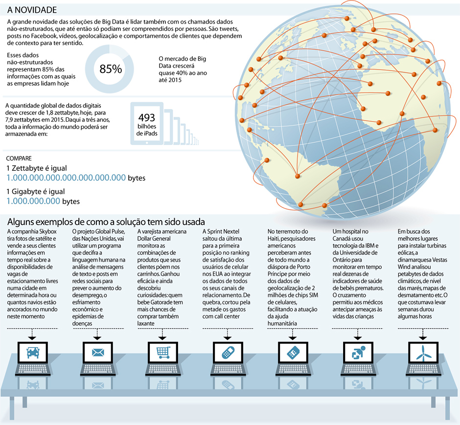 De acordo com O Globo (2014) Big Data é o conjunto de soluções tecnológicas capaz de lidar com dados digitais em volume, variedade e velocidade inéditos até hoje. Na prática, a tecnologia permite analisar qualquer tipo de informação digital em tempo real, sendo fundamental para a tomada de decisões.